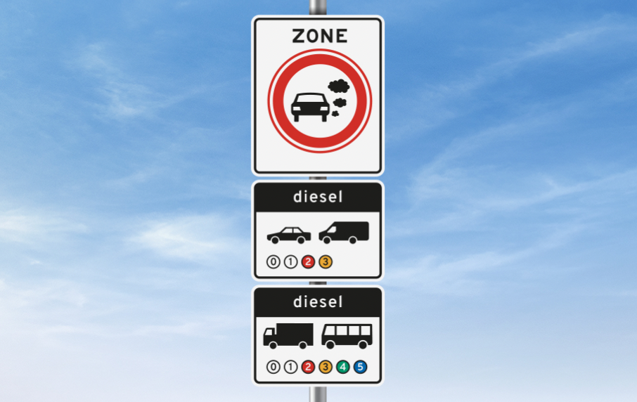 Het extra bord onder het verkeersbord heeft afbeeldingen van voertuigen met daarbij emissieklassen. Milieuzones gelden alleen voor dieselvoertuigen. In dit voorbeeld mogen dieselpersonenauto’s en dieselbestelauto’s met emissieklasse 3 of lager de milieuzone niet in. Dieselvrachtauto’s en dieselbussen met emissieklasse 5 of lager mogen de milieuzone ook niet in.